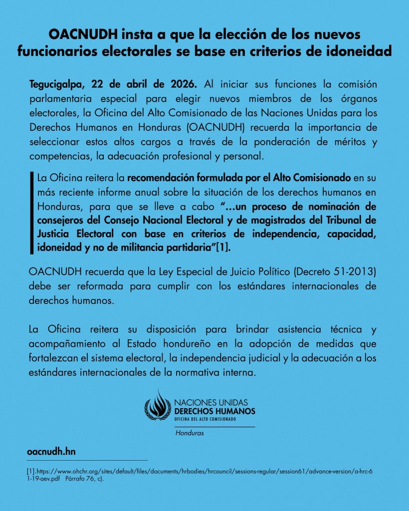 La Oficina del Alto Comisionado de las Naciones Unidas para los Derechos Humanos en Honduras (OACNUDH), exhortó a que la elección de las nuevas autoridades electorales en el país se base en criterios de idoneidad y no en intereses de política partidaria, en el marco del proceso de selección de altos funcionarios.