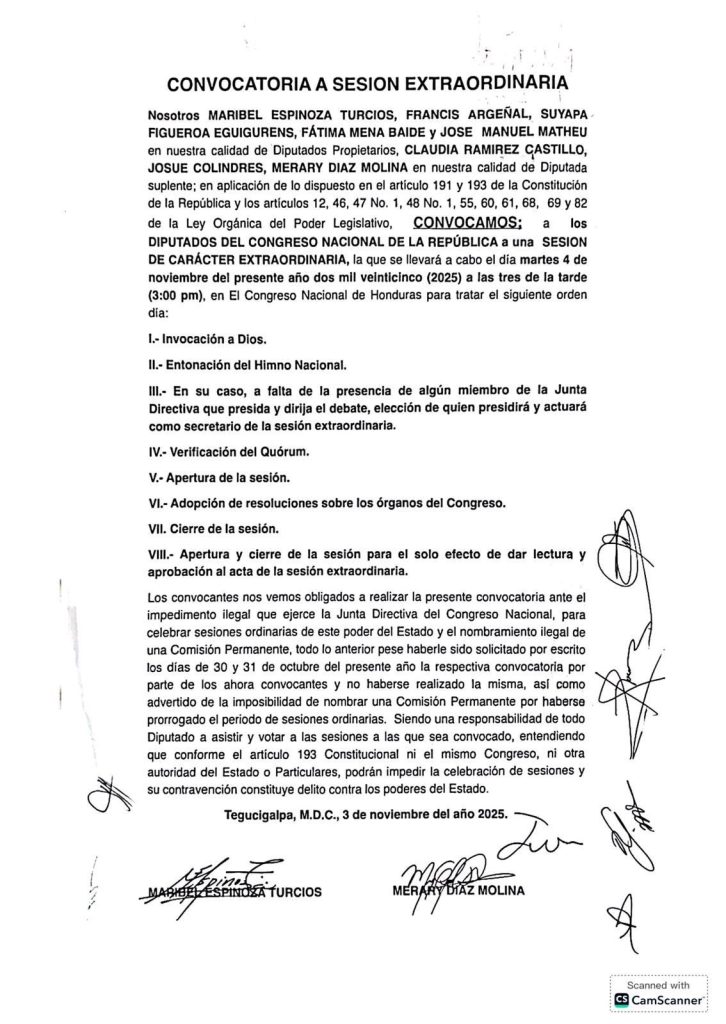 La convocatoria fue firmada por reconocidos congresistas opositores, entre ellos Maribel Espinoza, Fátima Mena, Francis Argeñal, Suyapa Figueroa, Claudia Ramírez, Josué Colindres, José Manuel Matheu y la propia Merary Díaz, quienes califican la actuación de la directiva como un “impedimento ilegal” para evitar que el pleno recupere su funcionamiento normal.