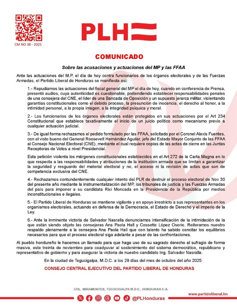 El comunicado, firmado por el Consejo Central Ejecutivo del Partido Liberal (CCEPL), marca un nuevo punto de tensión en el proceso electoral, en medio de denuncias cruzadas de fraude, presiones políticas y enfrentamientos entre el gobierno, el Ministerio Público y los órganos electorales.