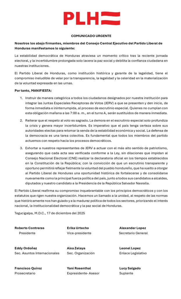 El comunicado fue firmado por las principales autoridades del Partido Liberal y fechado en Tegucigalpa, M.D.C., el 17 de diciembre de 2025, en un contexto donde el avance del escrutinio especial se ha convertido en el eje central del debate político nacional.