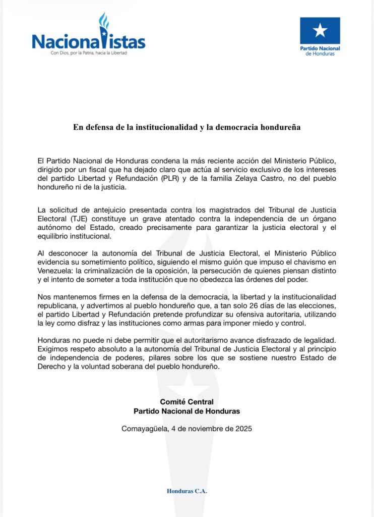 El Partido Nacional se declara «firmes en la defensa de la democracia, la libertad y la institucionalidad republicana». Advierte al pueblo hondureño que el partido de gobierno, Libre y Refundación, pretende «profundizar su ofensiva autoritaria» utilizando la ley como disfraz y a las instituciones como «armas para imponer miedo y control».