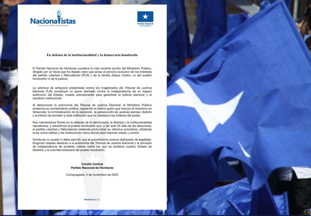 El Partido Nacional se declara «firmes en la defensa de la democracia, la libertad y la institucionalidad republicana». Advierte al pueblo hondureño que el partido de gobierno, Libre y Refundación, pretende «profundizar su ofensiva autoritaria» utilizando la ley como disfraz y a las instituciones como «armas para imponer miedo y control».