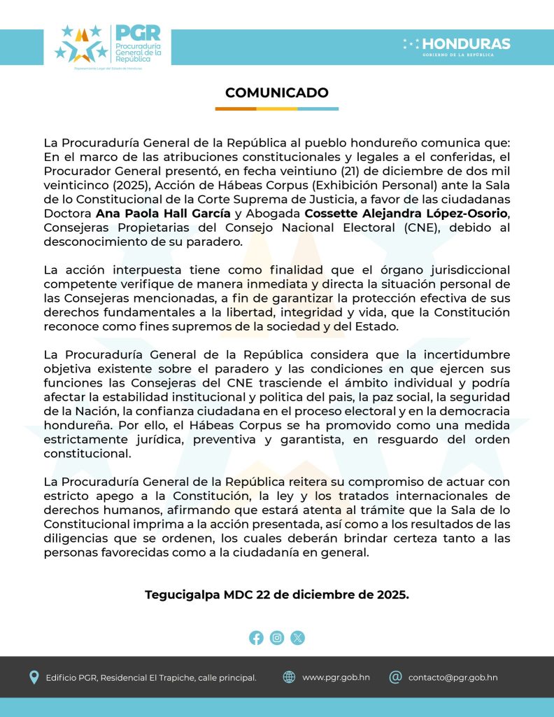 De acuerdo con un comunicado dirigido al pueblo hondureño, la acción fue presentada el 21 de diciembre de 2025 ante la Sala Constitucional, como una medida preventiva y garantista, orientada a la protección de la libertad, integridad y vida de las funcionarias electorales, en el marco de las atribuciones constitucionales y legales conferidas al Procurador General de la República.