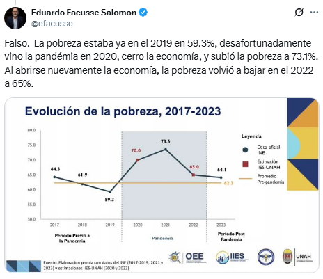 “Desafortunadamente vino la pandemia en 2020, cerró la economía, y subió la pobreza a 73.1 %. Al abrirse nuevamente la economía, la pobreza volvió a bajar en el 2022 a 65 %”, publicó el empresario en su cuenta de X. El mensaje fue acompañado por una tabla que muestra la evolución de la pobreza entre 2017 y 2023.