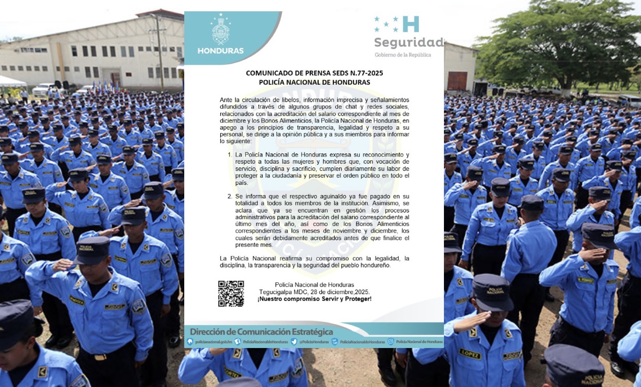 La Policía Nacional de Honduras aseguró este lunes que los salarios correspondientes al mes de diciembre y los bonos alimenticios de noviembre y diciembre serán acreditados antes de que finalice el presente año, en medio de versiones que circularon en redes sociales y grupos de mensajería sobre supuestos atrasos en los pagos.