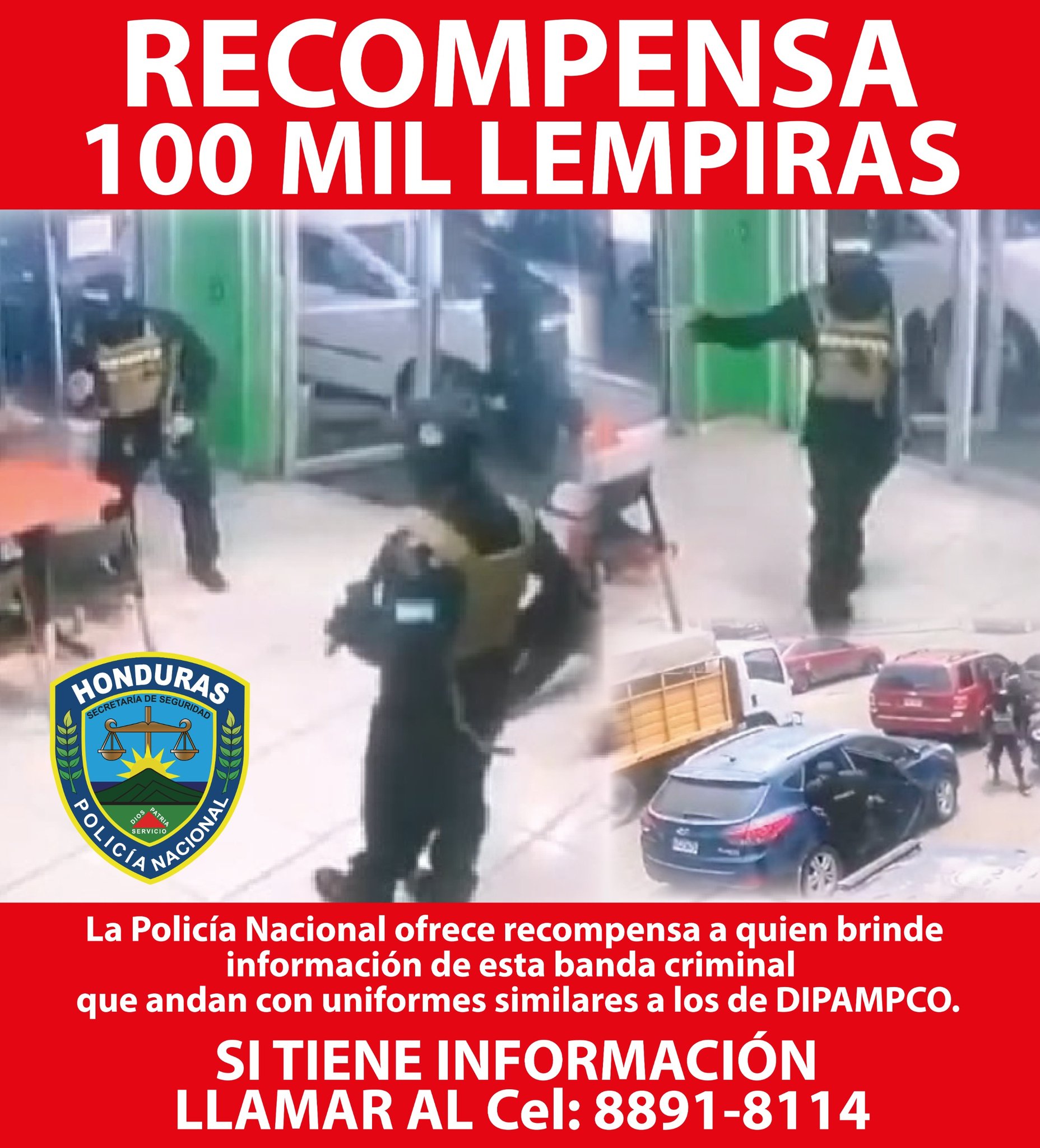 La Policía Nacional ofrece 100 mil lempiras como recompensa a quien que brinde información sobre la banda criminal que utilizó uniformes similares a los de la Dirección Policial Anti Maras y Pandillas Contra el Crimen Organizado (Dipampco) para asaltar un autolote este sábado en la 6ta calle de San Pedro Sula, Cortés.