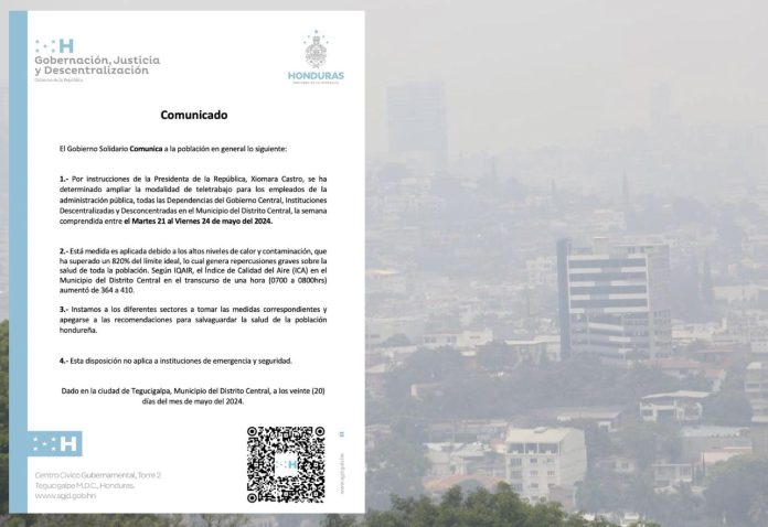 El Gobierno anunció una extensión en la modalidad de teletrabajo para los empleados del sector público en el municipio del Distrito Central debido a la contaminación que existe en el aire.