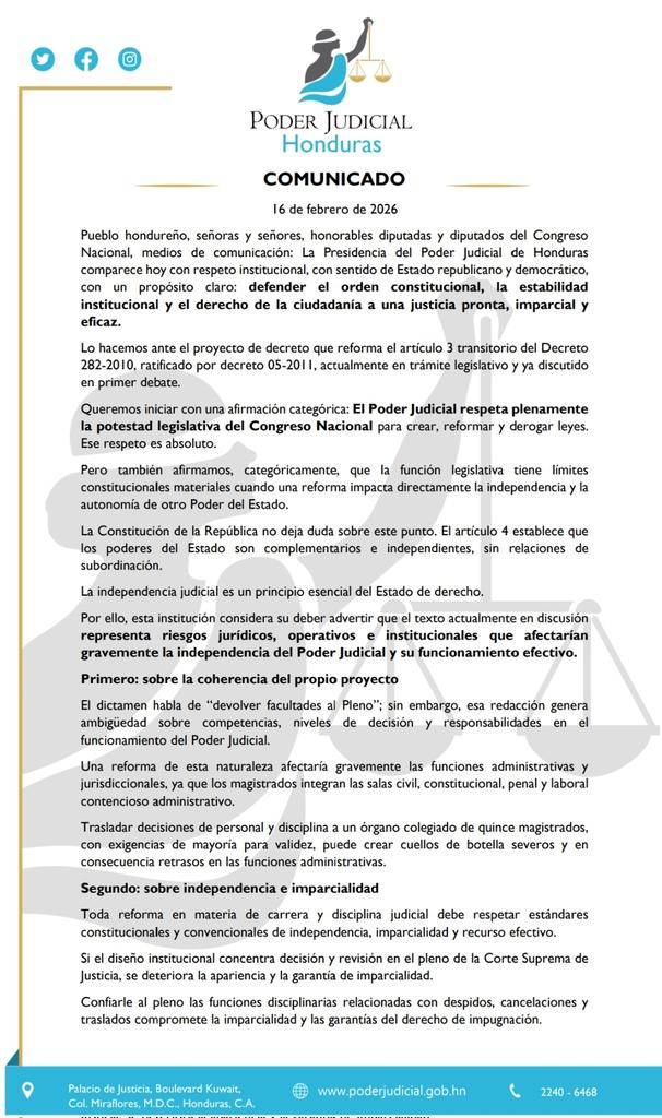 La presidencia de la Corte Suprema de Justicia de Honduras (CSJ) advirtió este lunes que la iniciativa de ley que busca retirarle facultades administrativas representa un riesgo para la independencia del Poder Judicial, luego de que el Congreso Nacional de Honduras aprobara el proyecto en primer debate.