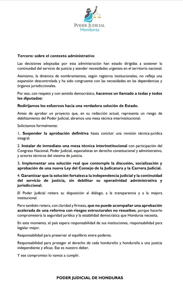 Asimismo, pidió suspender la discusión legislativa hasta avanzar en una reforma integral que contemple la aprobación de una nueva Ley del Consejo de la Judicatura y de la Carrera Judicial.