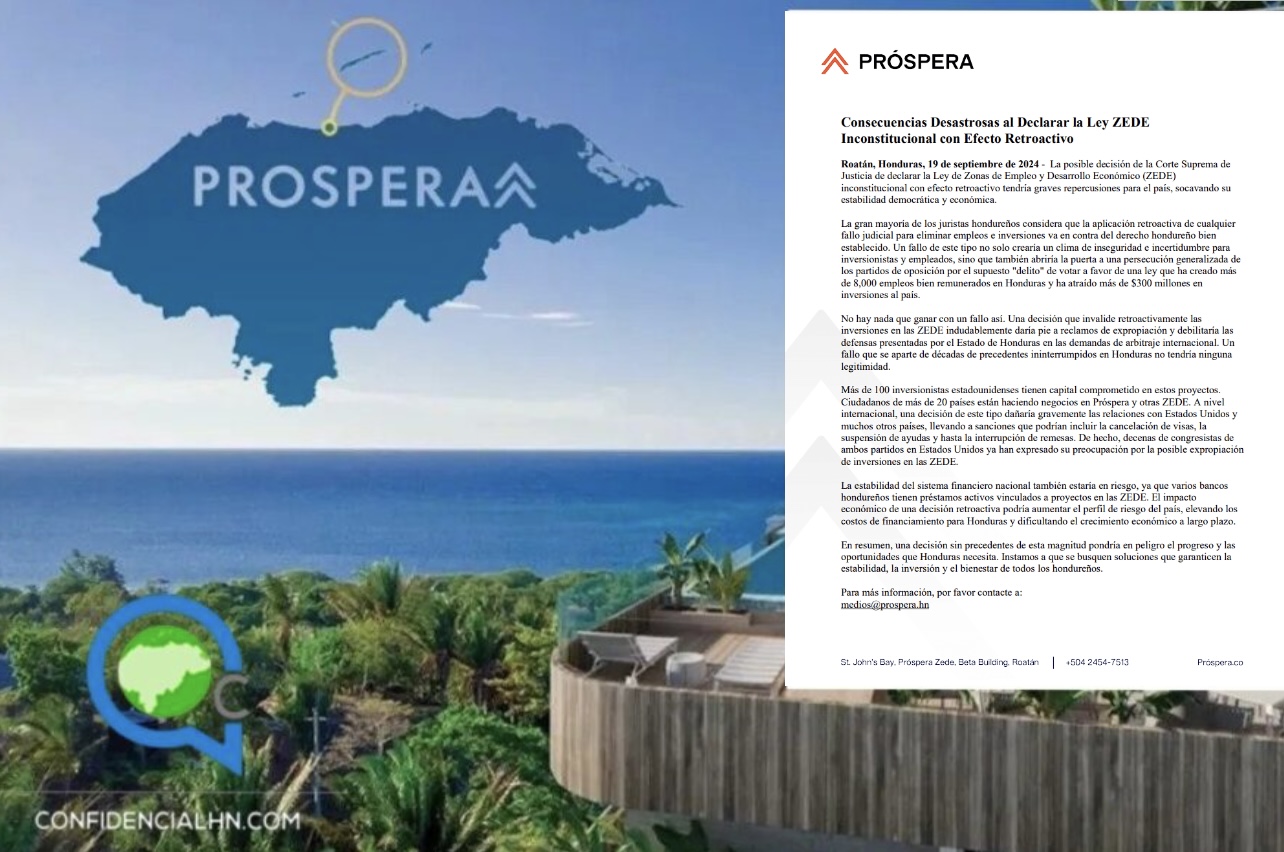El comunicado advierte, además, que ciudadanos de más de 20 países hacen negocios actualmente en Próspera y otras ZEDEs, y que una decisión contraria dañaría de forma considerable las relaciones internacionales, en particular con Estados Unidos, lo cual podría derivar en sanciones, cancelaciones de visas y restricciones en las remesas y la ayuda internacional.