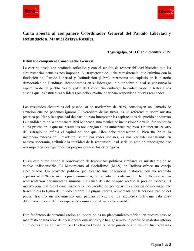 En una carta extensa, frontal y cargada de autocrítica, el diputado y dirigente de Libertad y Refundación (Libre), Rasel Tomé, se dirigió al coordinador general del partido, Manuel Zelaya Rosales, para advertir que la organización atraviesa una crisis profunda que requiere un cambio de rumbo inmediato.