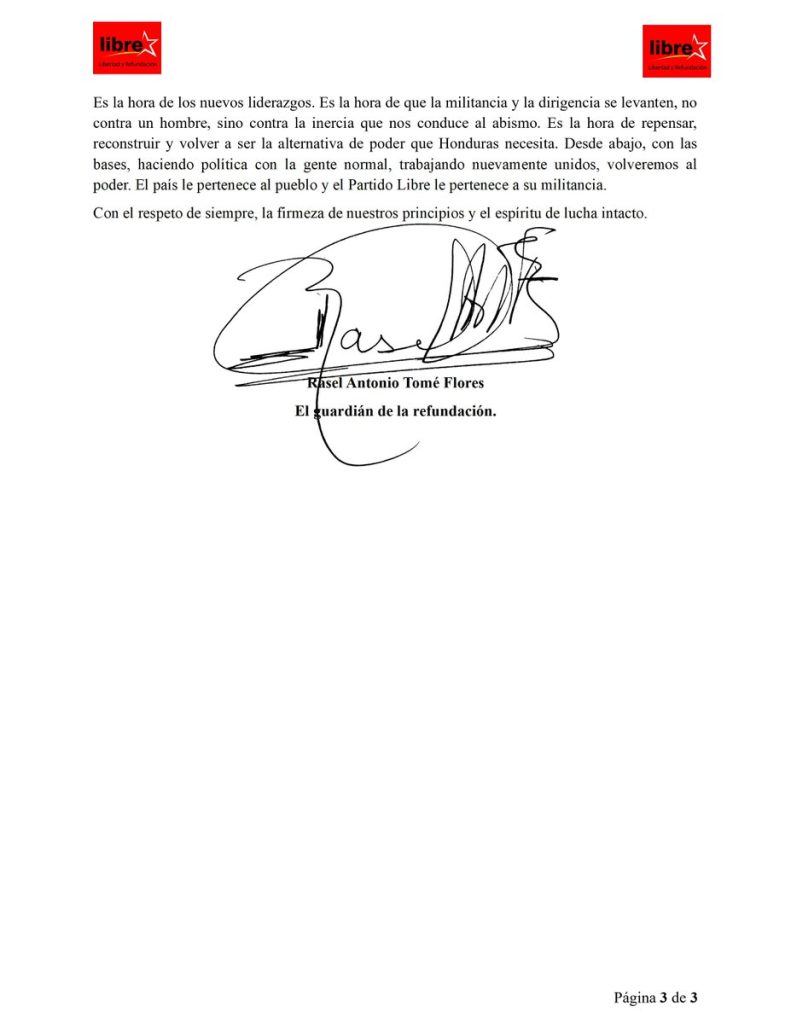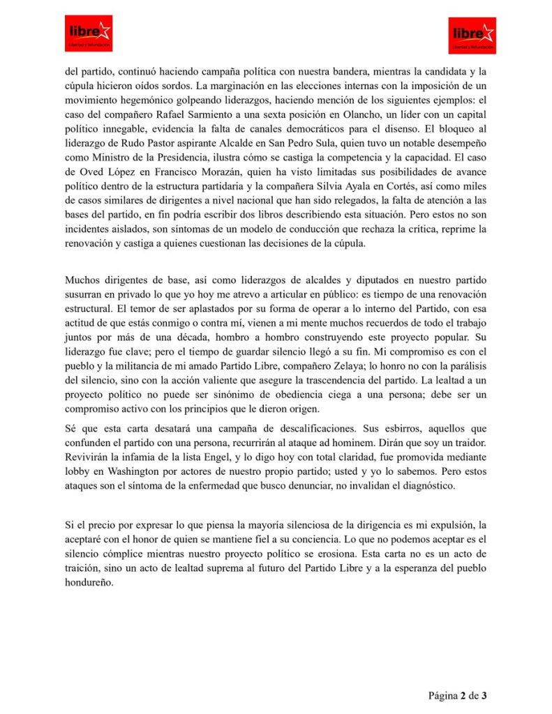 La carta culmina con un mensaje directo a Zelaya y a la dirigencia nacional: “Es la hora de los nuevos liderazgos.