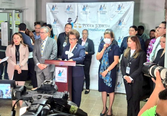 La magistrada presidenta de la Corte Suprema de Justicia (CSJ), Rebecca Ráquel Obando, se presentó este lunes en las instalaciones del Circuito Jurisdiccional en Materia de Criminalidad Organizada, Medio Ambiente y Corrupción, para ofrecer una conferencia de prensa tras la captura del juez Marco Vallecillo, quien enfrenta acusaciones de extorsión.