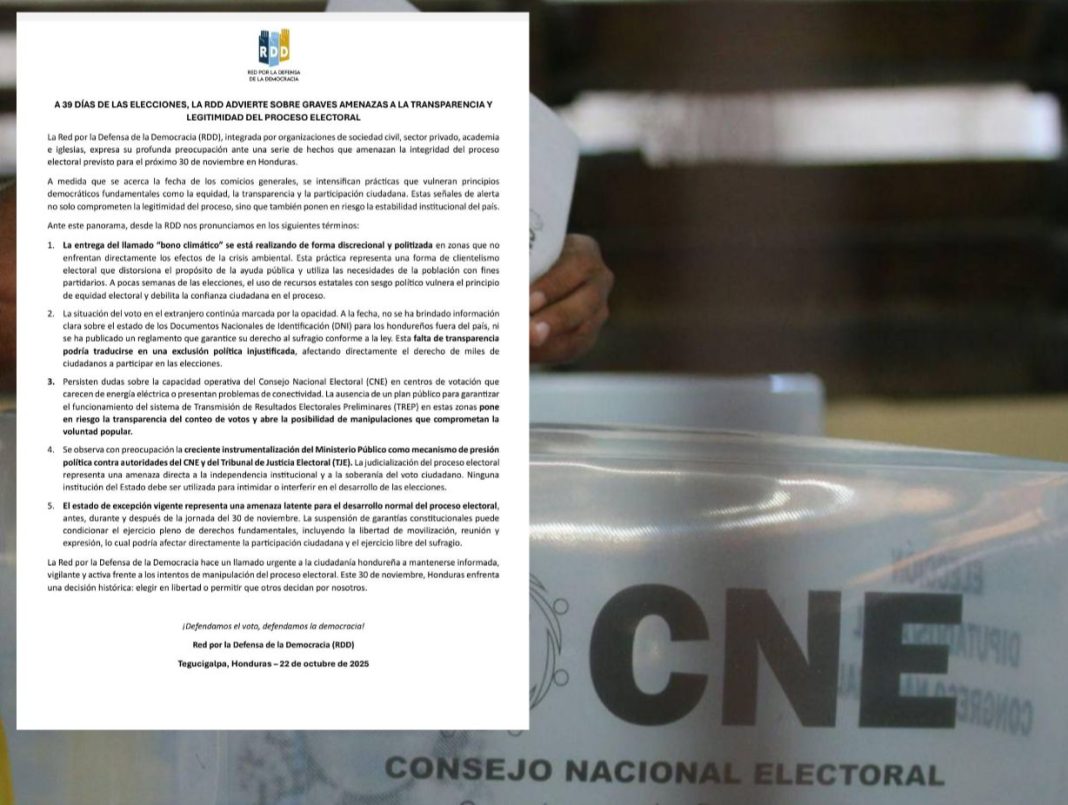 A poco más de un mes de las elecciones generales, la Red por la Defensa de la Democracia (RDD) advirtió este miércoles sobre graves amenazas a la transparencia y legitimidad del proceso electoral en Honduras.