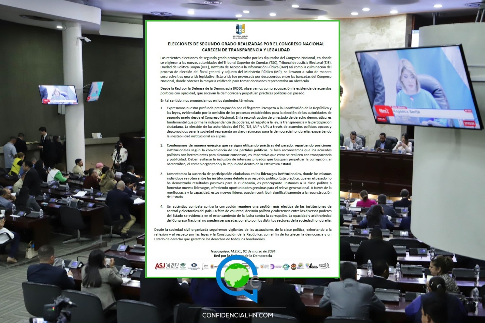 La RDD recordó que las recientes elecciones de segundo grado protagonizadas por los diputados del Congreso Nacional, en donde se eligieron a las nuevas autoridades del Tribunal Superior de Cuentas (TSC), Tribunal de Justicia Electoral (TJE), Unidad de Política Limpia (UPL), Instituto de Acceso a la Información Pública (IAIP) así como la culminación del proceso de elección del fiscal general y adjunto del Ministerio Público (MP), se llevaron a cabo de manera sorpresiva tras una crisis legislativa.