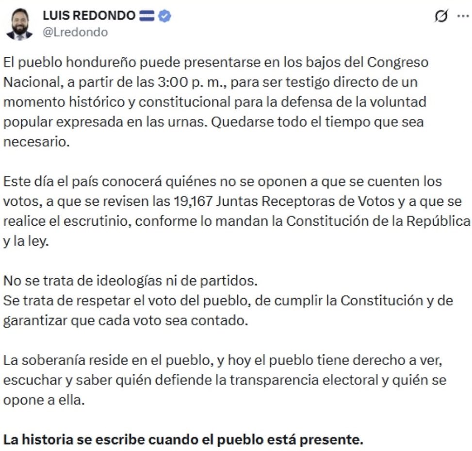 En paralelo a la convocatoria legislativa, Redondo hizo un llamado directo a los colectivos del partido Libertad y Refundación (Libre) y a la ciudadanía en general para que se concentren en los bajos del Congreso Nacional a partir de las 3:00 p. m., y permanezcan en el lugar “el tiempo que sea necesario”.