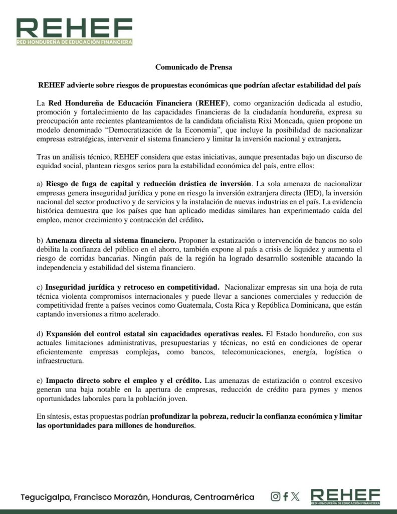 La Red Hondureña de Educación Financiera (REHEF) lanzó este jueves una advertencia contundente sobre el plan económico de la candidata oficialista Rixi Moncada, asegurando que su propuesta de “Democratización de la Economía” podría provocar severas consecuencias para Honduras, incluyendo fuga de capitales, caída de inversión, riesgo bancario y deterioro del empleo.