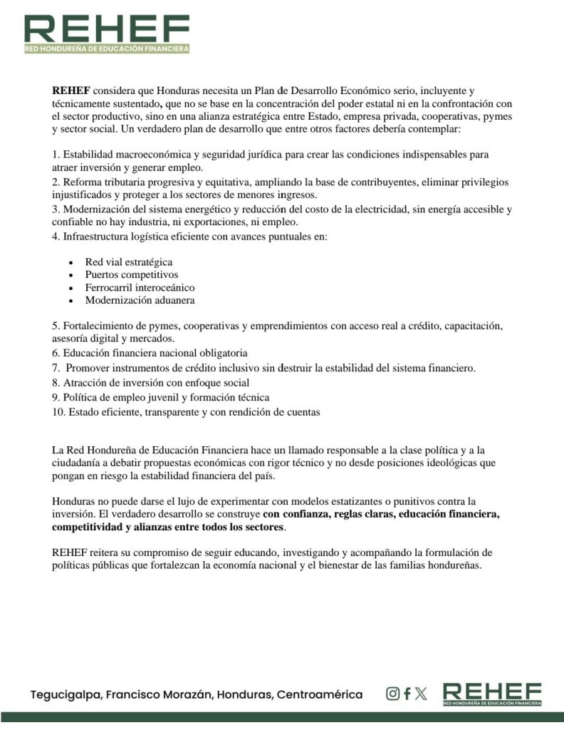 “Honduras no puede darse el lujo de experimentar con modelos estatizantes o punitivos contra la inversión. El desarrollo se construye con confianza, reglas claras y competitividad”, enfatizó REHEF.