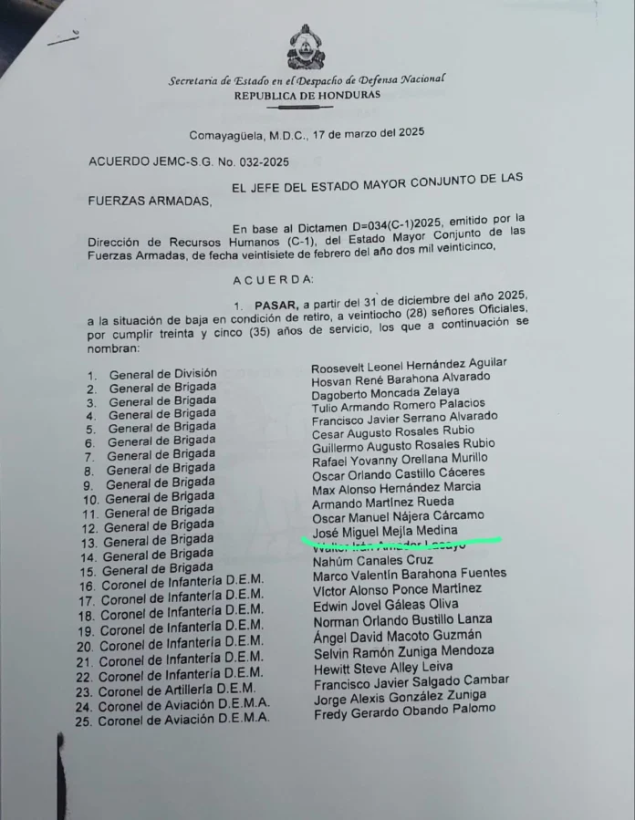 El jefe del Estado Mayor Conjunto de las Fuerzas Armadas de Honduras, general de división Roosevelt Leonel Hernández Aguilar, encabeza el listado oficial de 28 altos mandos que serán pasados a condición de retiro el 31 de diciembre de 2025, según un acuerdo difundido por la institución castrense.