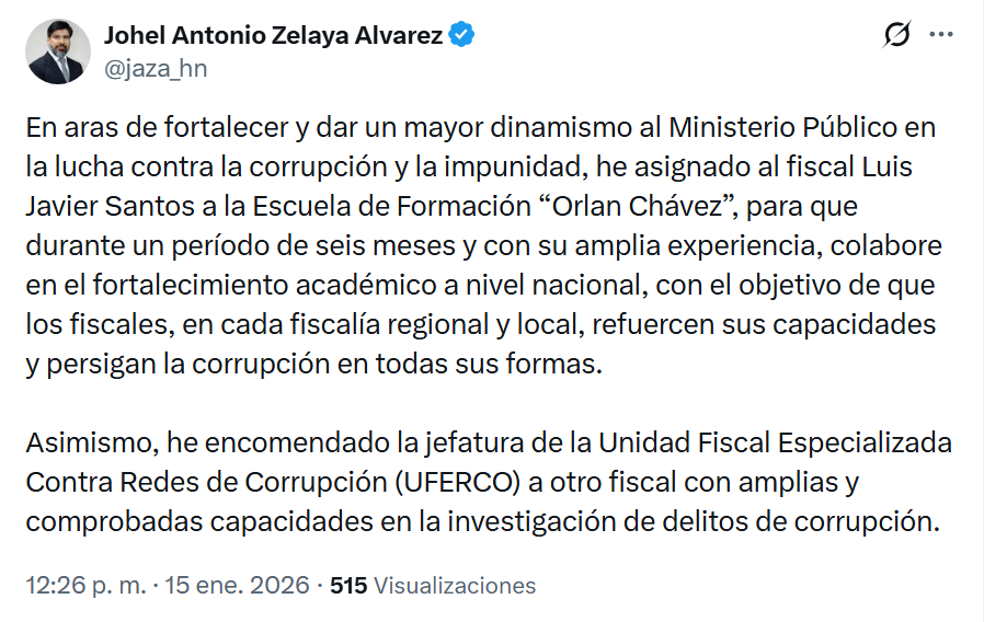 Al mismo tiempo, Zelaya confirmó que ha encomendado la jefatura de la UFERCO a otro fiscal, a quien describió como un profesional con “amplias y comprobadas capacidades en la investigación de delitos de corrupción”, aunque sin revelar por ahora su identidad.