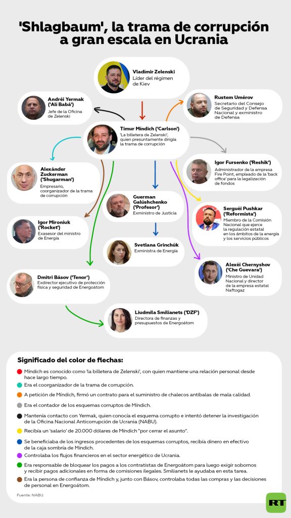El lunes pasado, el diputado ucraniano Yaroslav Zhelezniak afirmó que Yermak podría ser el ‘Alí Babá’ que figura en las llamadas ‘cintas de Míndich’, grabaciones de horas de conversación entre los aliados más cercanos del líder del régimen de Kiev, acusados ahora de corrupción. Según sus datos, la ‘mano derecha’ de Zelenski dirigió personalmente la aprobación de la ley que llevó a la liquidación de la independencia institucional de la Fiscalía Especial Anticorrupción (SAP) y la Oficina Nacional Anticorrupción de Ucrania (NABU), una iniciativa que finalmente fue retirada tras presiones de Occidente.