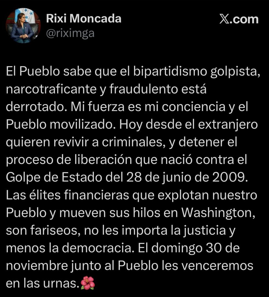 En un mensaje difundido en su cuenta de X, Moncada aseguró que el pueblo hondureño no se deja engañar: “El Pueblo sabe que el bipartidismo golpista, narcotraficante y fraudulento está derrotado”.