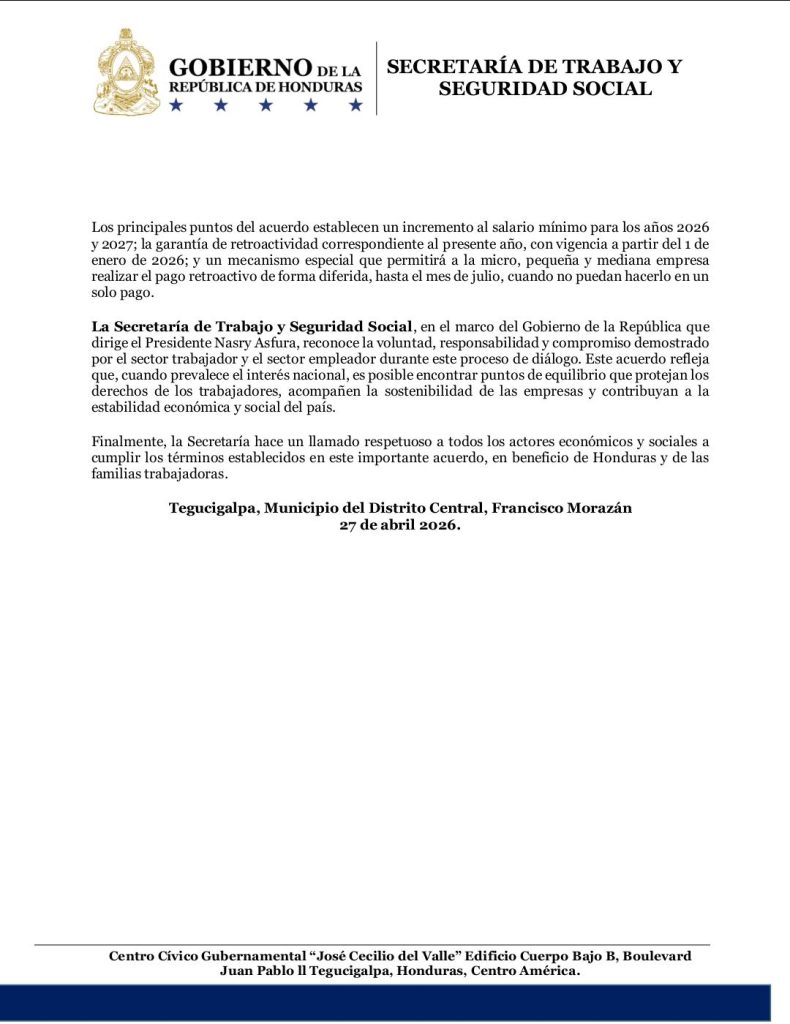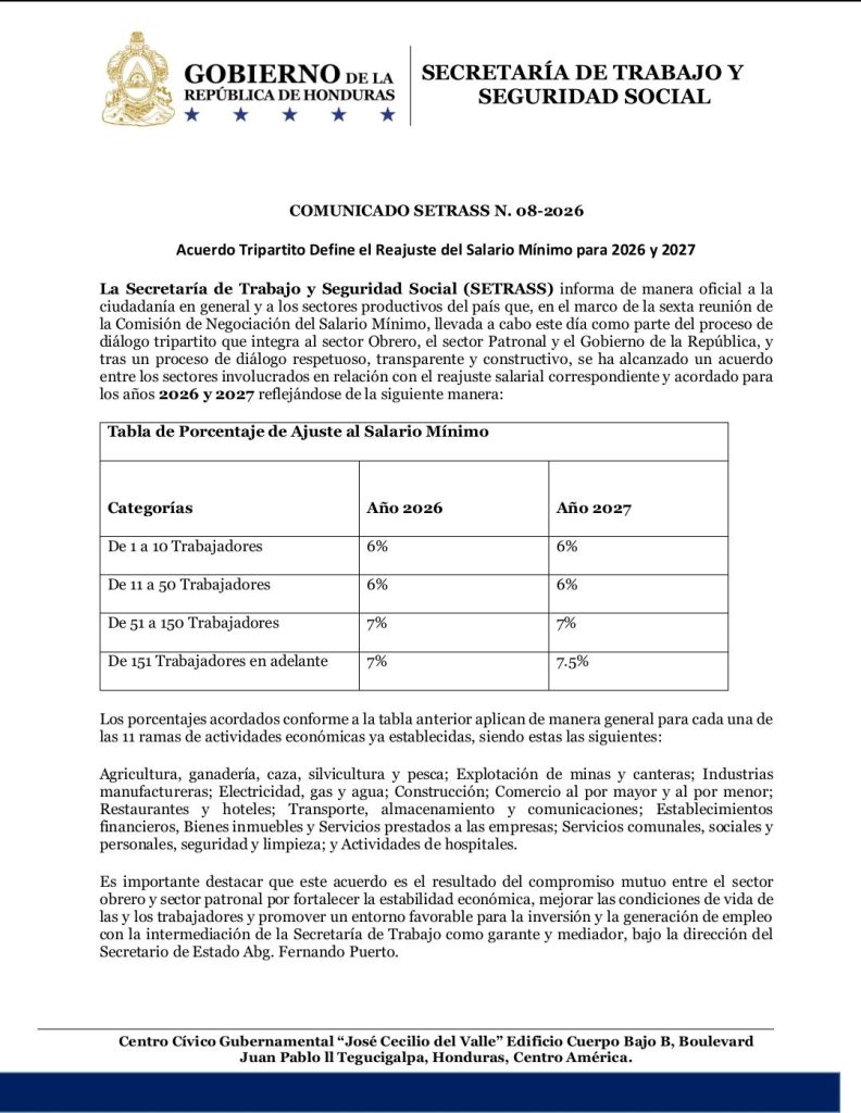 Tras semanas de negociaciones, representantes del sector privado y de las centrales obreras alcanzaron este lunes un acuerdo para el ajuste del salario mínimo en Honduras, estableciendo incrementos de entre el 6 % y el 7.5 % para los años 2026 y 2027.