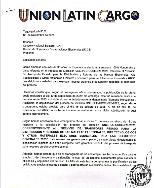 La compañía hondureña remitió una carta formal al CNE y a la Unidad de Compras y Contrataciones Especiales notificando su decisión, lo que deja sin proveedor al servicio clave de distribución y retorno de maletas electorales, kits tecnológicos y demás materiales esenciales para la jornada del 30 de noviembre.