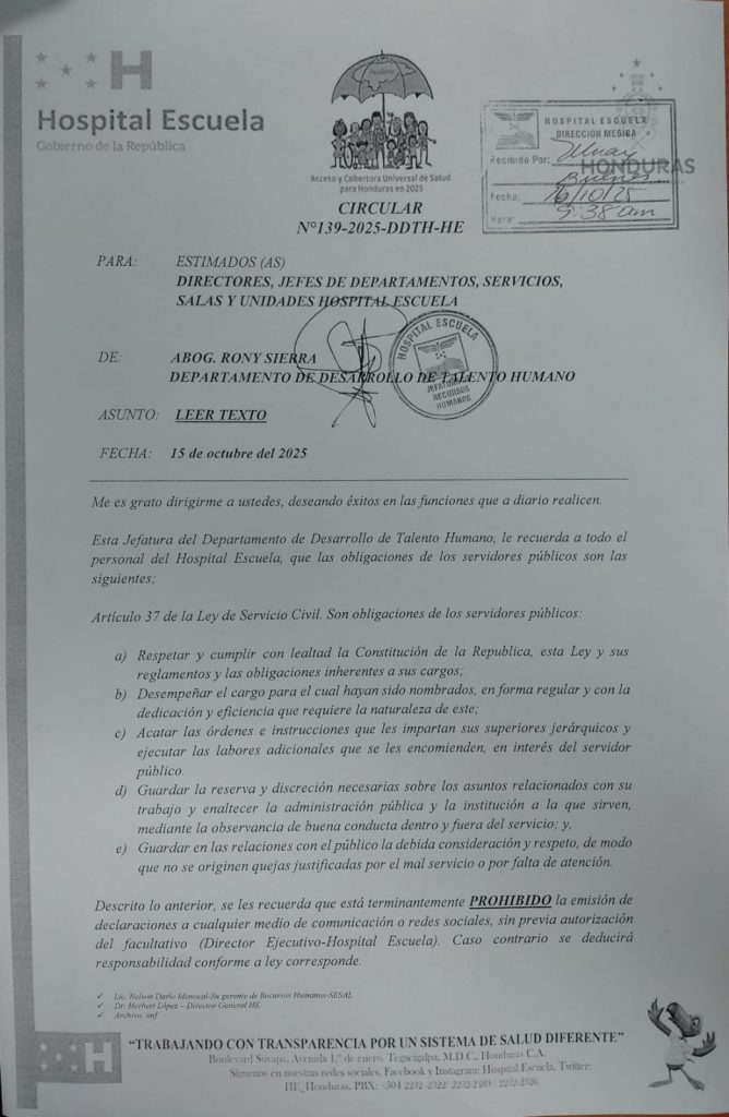 El Hospital Escuela, principal centro asistencial de Honduras, emitió una circular que prohíbe a médicos y personal administrativo ofrecer declaraciones a medios de comunicación o expresarse en redes sociales sin autorización previa de la dirección ejecutiva.