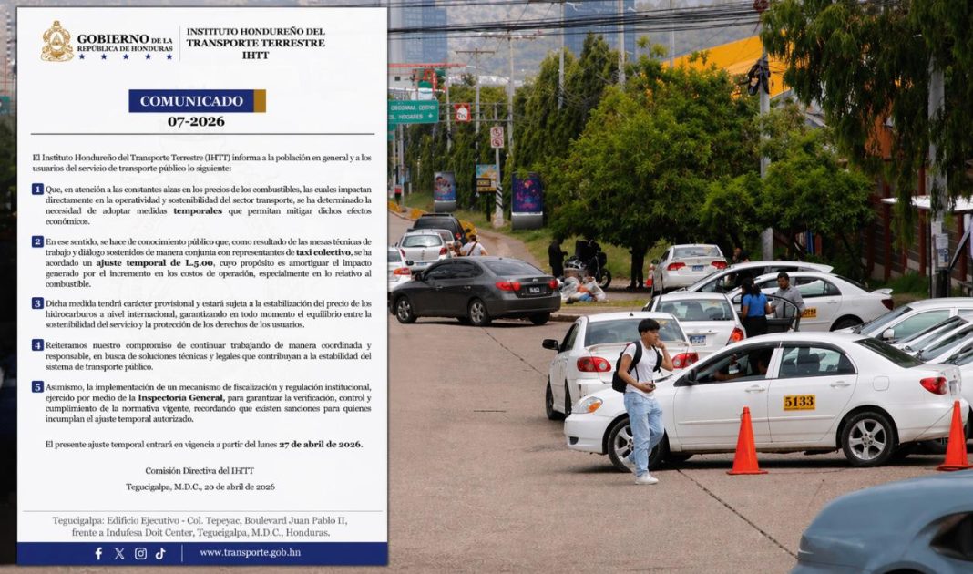 El costo del transporte vuelve a subir en Honduras. El Instituto Hondureño del Transporte Terrestre (IHTT) oficializó un aumento de cinco lempiras en la tarifa del taxi colectivo, una medida que comenzará a aplicarse a partir del lunes 27 de abril de 2026.