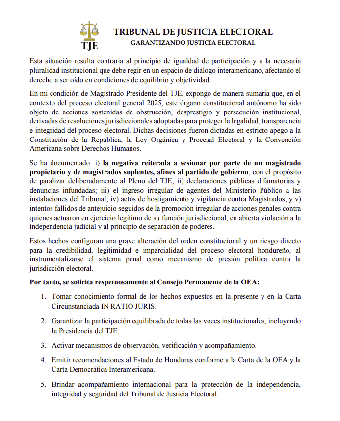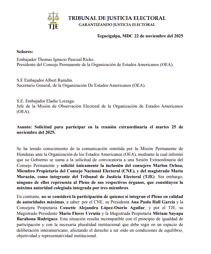 El magistrado presidente del Tribunal de Justicia Electoral (TJE), Mario Flores Urrutia, elevó este lunes una advertencia formal ante el Consejo Permanente de la Organización de Estados Americanos (OEA), al denunciar que el Gobierno hondureño pretende excluir a las máximas autoridades electorales de la reunión extraordinaria convocada para este martes.
