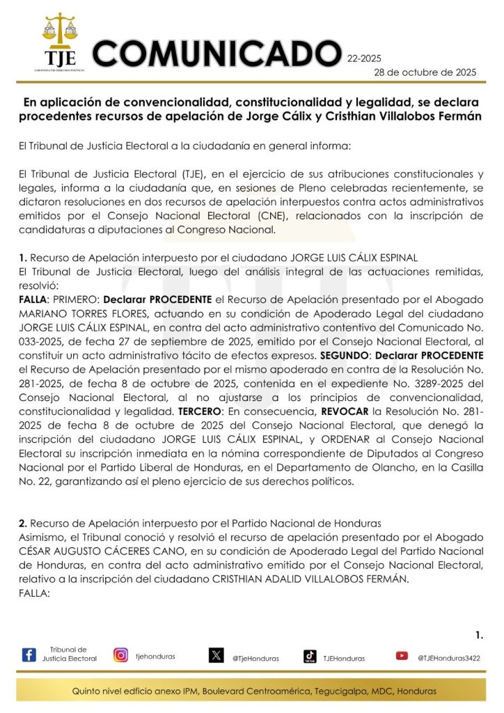 El Tribunal de Justicia Electoral (TJE) resolvió este martes, por mayoría simple, declarar procedentes los recursos de apelación presentados por los aspirantes Jorge Cálix y Cristian Villalobos, confirmando así sus inscripciones como candidatos a diputados por los departamentos de Olancho y Valle, respectivamente.