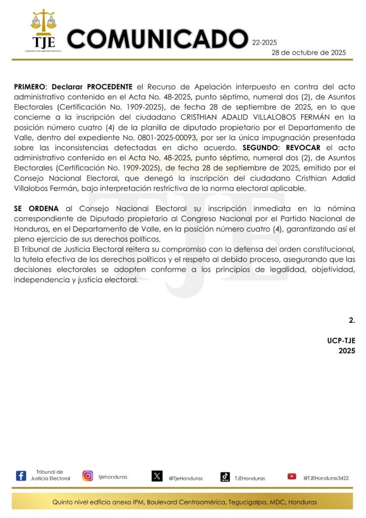 En la misma resolución, el TJE declaró procedente el recurso de apelación interpuesto por el Partido Nacional de Honduras, a través de su apoderado legal César Cáceres Cano, en favor del ciudadano Cristian Adalid Villalobos Fermán, quien ahora queda oficialmente inscrito como candidato a diputado por el departamento de Valle.