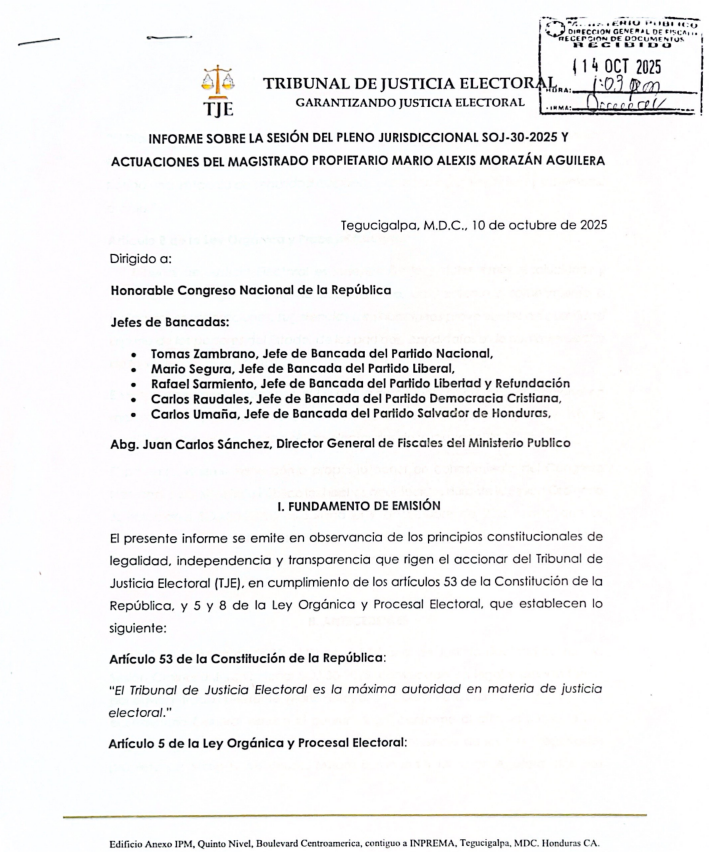 El Tribunal de Justicia Electoral (TJE) remitió un informe al Ministerio Público (MP) relacionado con el conflicto interno surgido en el pleno de magistrados, luego de que el magistrado Mario Alexis Morazán Aguilera denunciara a sus compañeros por los presuntos delitos de prevaricato, usurpación de funciones y tráfico de influencias.
