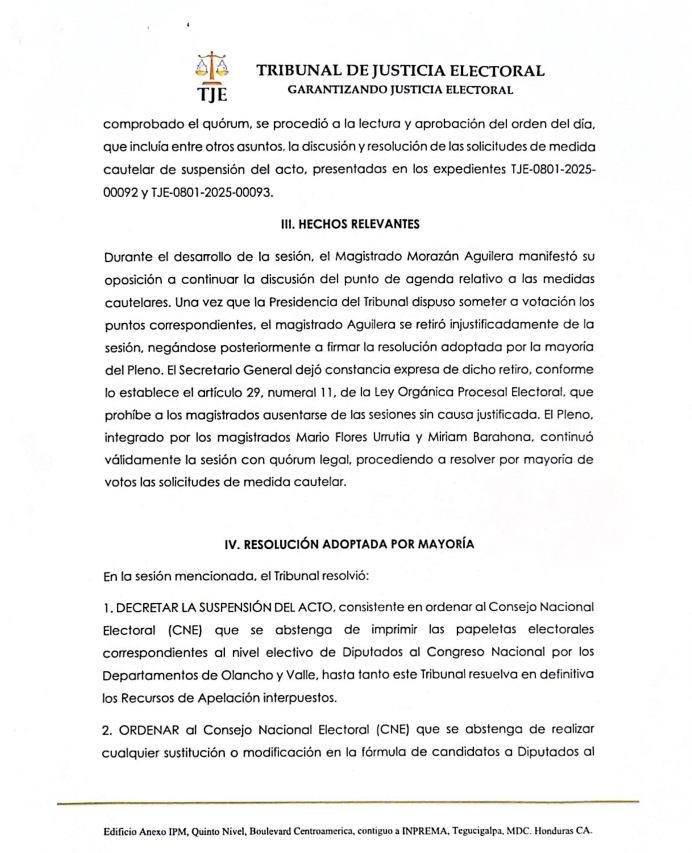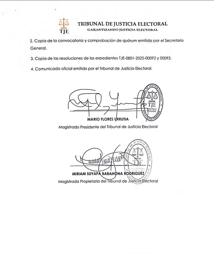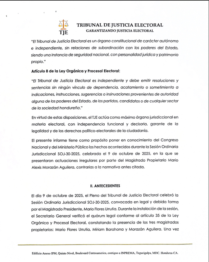 El documento, firmado por los magistrados Mario Flores Urrutia y Miriam Suyapa Barahona, busca justificar las actuaciones del pleno y sostiene que la sesión señalada por Morazán fue “válidamente instalada y desarrollada con quórum legal”, de acuerdo con lo establecido en la normativa interna del Tribunal.