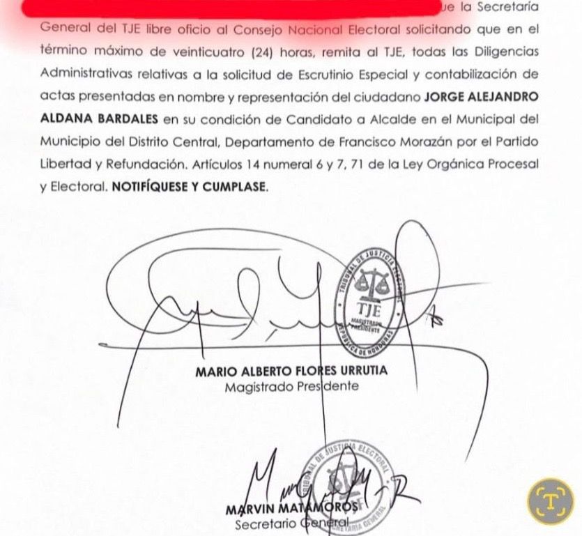 La instrucción fue emitida mediante oficio por el magistrado presidente del TJE, Mario Alberto Flores Urrutia, en el que se requiere al ente electoral entregar de forma íntegra el expediente administrativo vinculado a la petición interpuesta por Aldana, quien participó como candidato a la reelección por la Alcaldía Municipal del Distrito Central, bajo la bandera del Partido Libertad y Refundación (Libre).