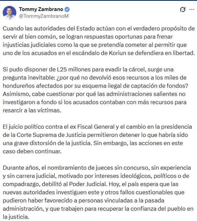 “Si pudo disponer de 25 millones de lempiras para evadir la cárcel, surge una pregunta inevitable: ¿por qué no devolvió esos recursos a los miles de hondureños afectados por su esquema ilegal de captación de fondos?”, expresó el jefe del Legislativo en su cuenta de X.