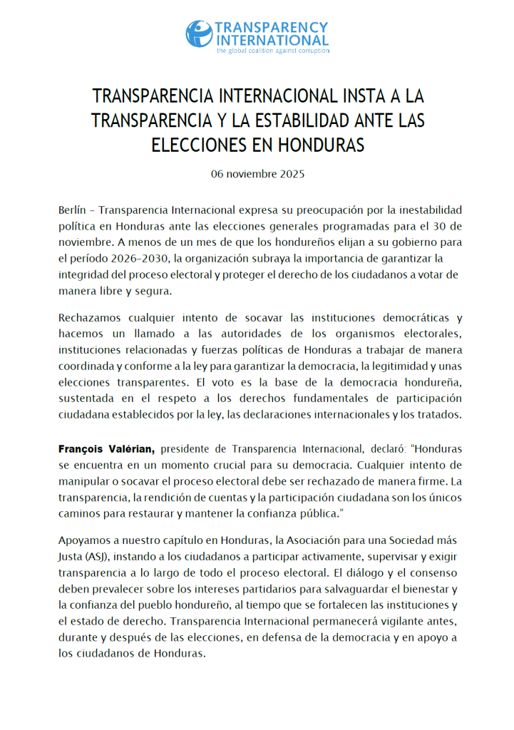 La organización también reafirmó su respaldo a su capítulo en Honduras, la Asociación para una Sociedad más Justa (ASJ), instando a la población a participar, supervisar y exigir claridad en cada etapa del proceso electoral.