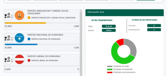 Mientras que, en segundo lugar, está el candidato del Partido Nacional, Denis Evelin Hernández Sorto, con un 43 Por ciento de la votación que equivale a mil 308 votos.
