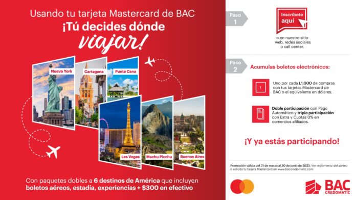 BAC y Mastercard, nuevamente premiando la lealtad de sus clientes presentan la campaña “Tú Decides Donde Viajar”, con la que sortearán 6 paquetes dobles que permitirán a los afortunados ganadores elegir 1 de los 6 destinos disponibles. Entre las opciones tendrán: Nueva York, Las Vegas, Cartagena, Punta Cana, Perú y Buenos Aires.