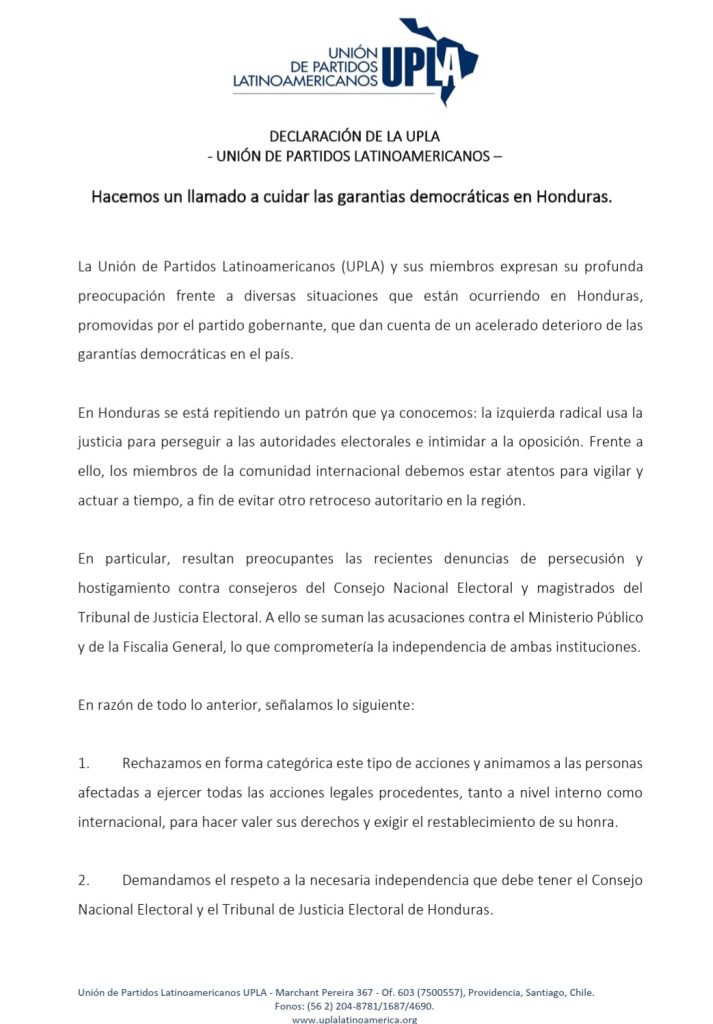 “En Honduras, la izquierda autoritaria está impulsando una jugada que ya conocemos: usa la justicia para perseguir a las autoridades electorales e intimidar a la oposición”, señala el comunicado oficial publicado por la organización, que agrupa a partidos de centroderecha y derecha democrática de América Latina.