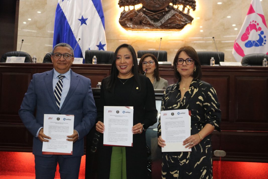 La carta de compromiso que oficializa el inicio del programa fue firmada por la vicepresidenta del Congreso Nacional, Lissi Matute Cano; la rectora de Unitec, Rosalpina Rodríguez; y el director ejecutivo de ASJ, Carlos Hernández.