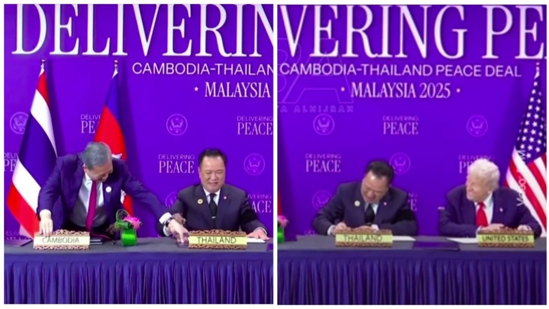 (RT en Español)- Durante la firma del acuerdo de alto el fuego entre Tailandia y Camboya en la cumbre de la Asociación de Naciones del Sudeste Asiático (Asean), las placas de estos dos países en la mesa resultaron confundidas. Ante ello, los primeros ministros Anutin Charnvirakul y Hun Manet notaron el desliz y cambiaron personalmente las placas entre las risas de los presentes. A su vez, el presidente estadounidense, Donald Trump, también tomó la situación con humor, sonriendo al firmar el documento.