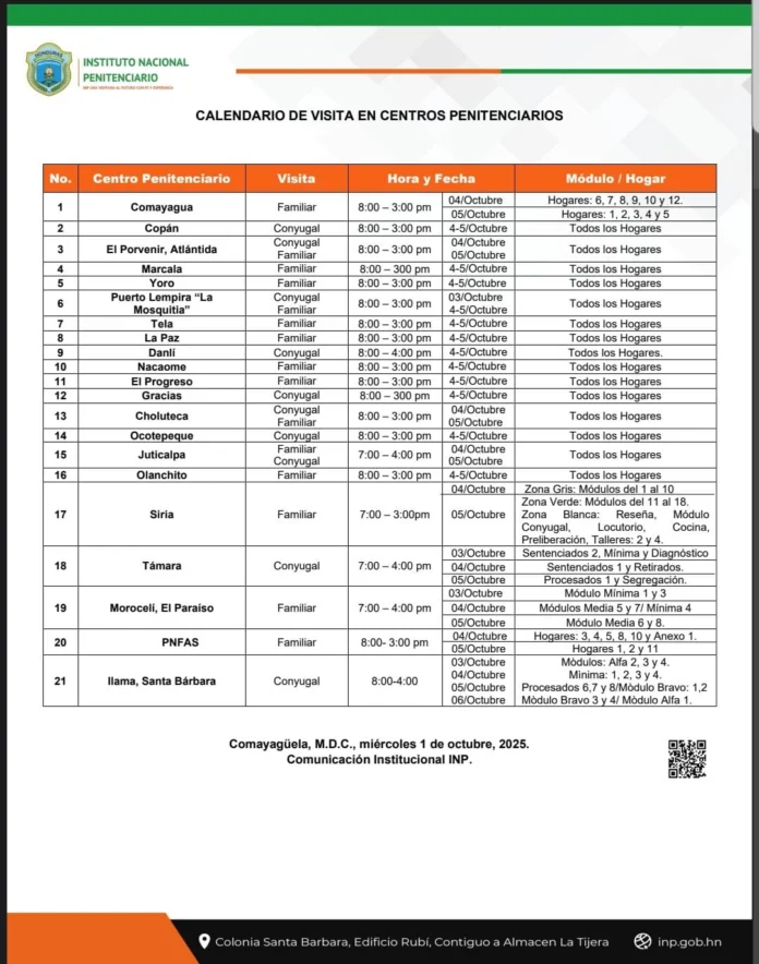 Igualmente, las visitas conyugales se realizarán en llama, Danlí, Gracias, Copán, Támara, Ocotepeque, Puerto Lempira. Así como en Choluteca, El Porvenir y Juticalpa.