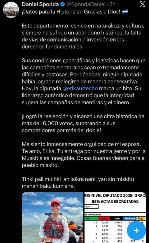 La salida de Sponda ocurrió apenas dos horas después de que el ahora exfuncionario publicara en su cuenta en X un mensaje felicitando a su esposa, Erika Urtecho, por haber logrado la reelección como diputada en la Mosquitia bajo la bandera del Partido Liberal, un triunfo opositor en una región clave.