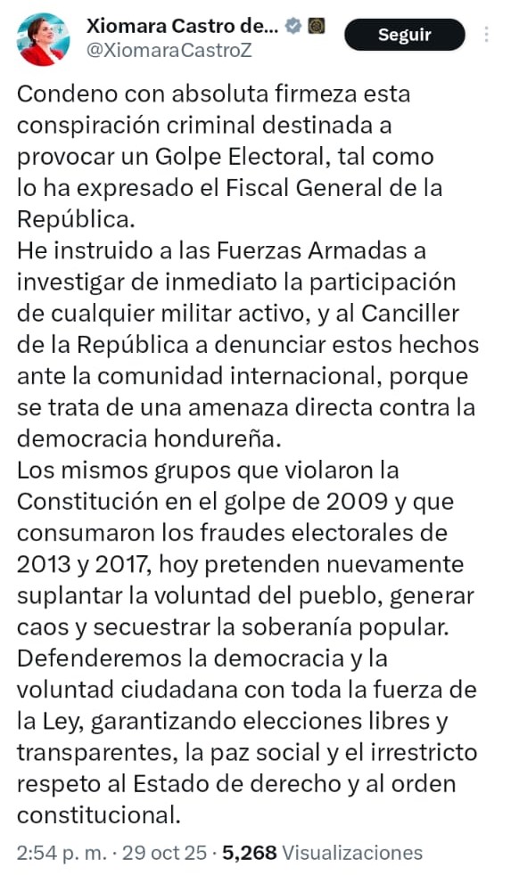 A través de un posteo en la red social “X”, la presidenta Xiomara Castro, instruyó a las Fuerzas Armadas (FF.AA.), investigar de inmediato la participación de cualquier militar activo en el presunto plan para una crisis poselectoral de parte de la consejera vocal del Consejo Nacional Electoral (CNE), Cossette López y el jefe de la bancada nacionalista, Tomás Zambrano.