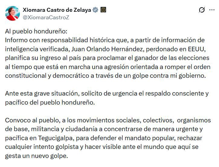 La presidenta de la República, Xiomara Castro, lanzó la madrugada de este martes un llamado urgente a los colectivos, movimientos sociales, organismos de base y a la ciudadanía en general para concentrarse de manera pacífica en Tegucigalpa, bajo el argumento de defender el orden constitucional y el mandato popular, en un contexto de creciente incertidumbre política tras las elecciones generales del pasado 30 de noviembre.