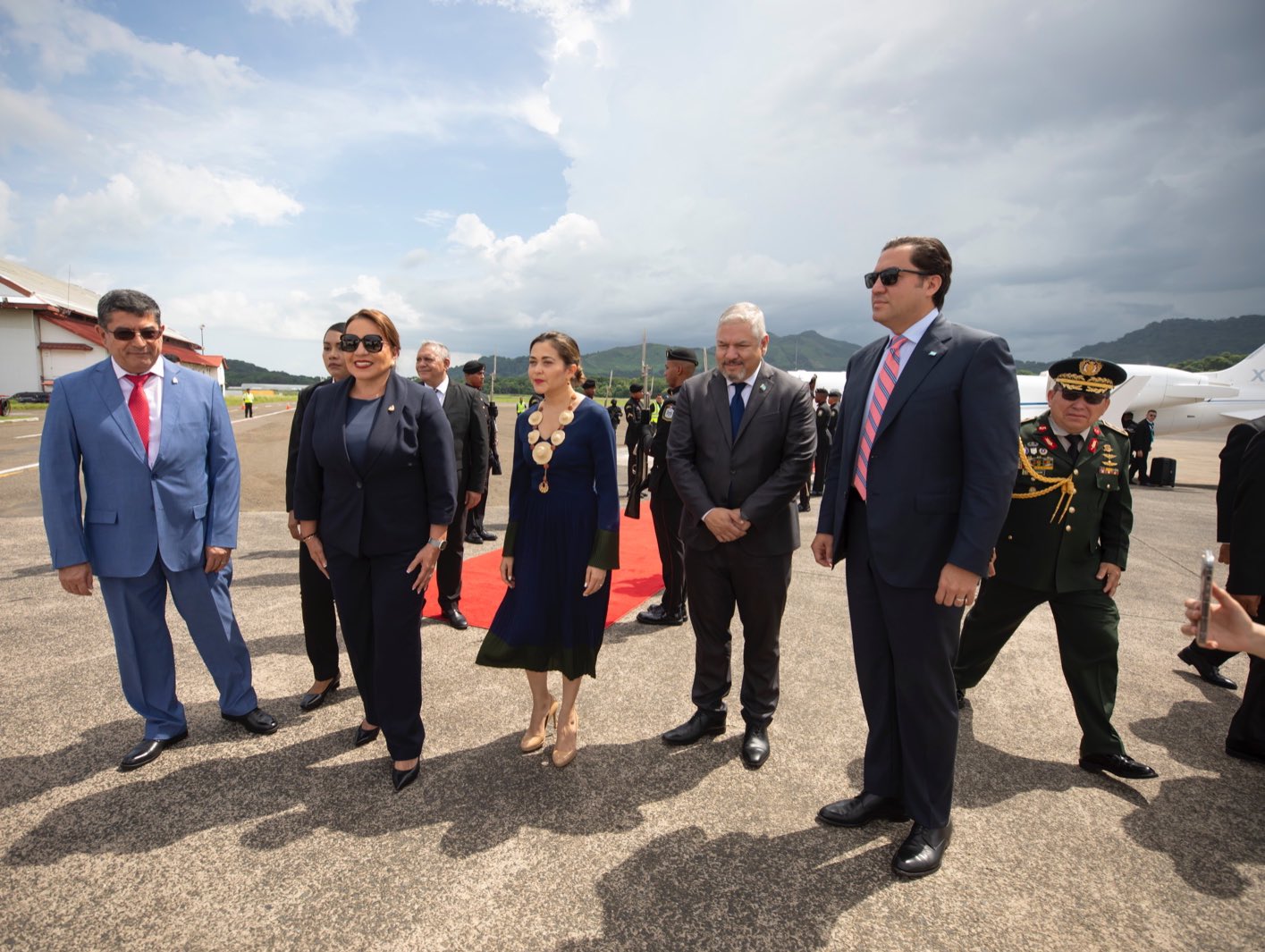 La gobernante hondureña fue recibida con todos los honores de ordenanza en el Aeropuerto Internacional Panamá Pacífico (BLB) por el embajador de Honduras en Panamá, Candelario Reyes García, además de las autoridades del gobierno saliente, la secretaria de Relaciones Exteriores, Janaina Isabel Tewaney Mencomo, y del gobierno entrante, Miguel Lecaro Bárcenas, integrante de la Comisión de Traspaso.