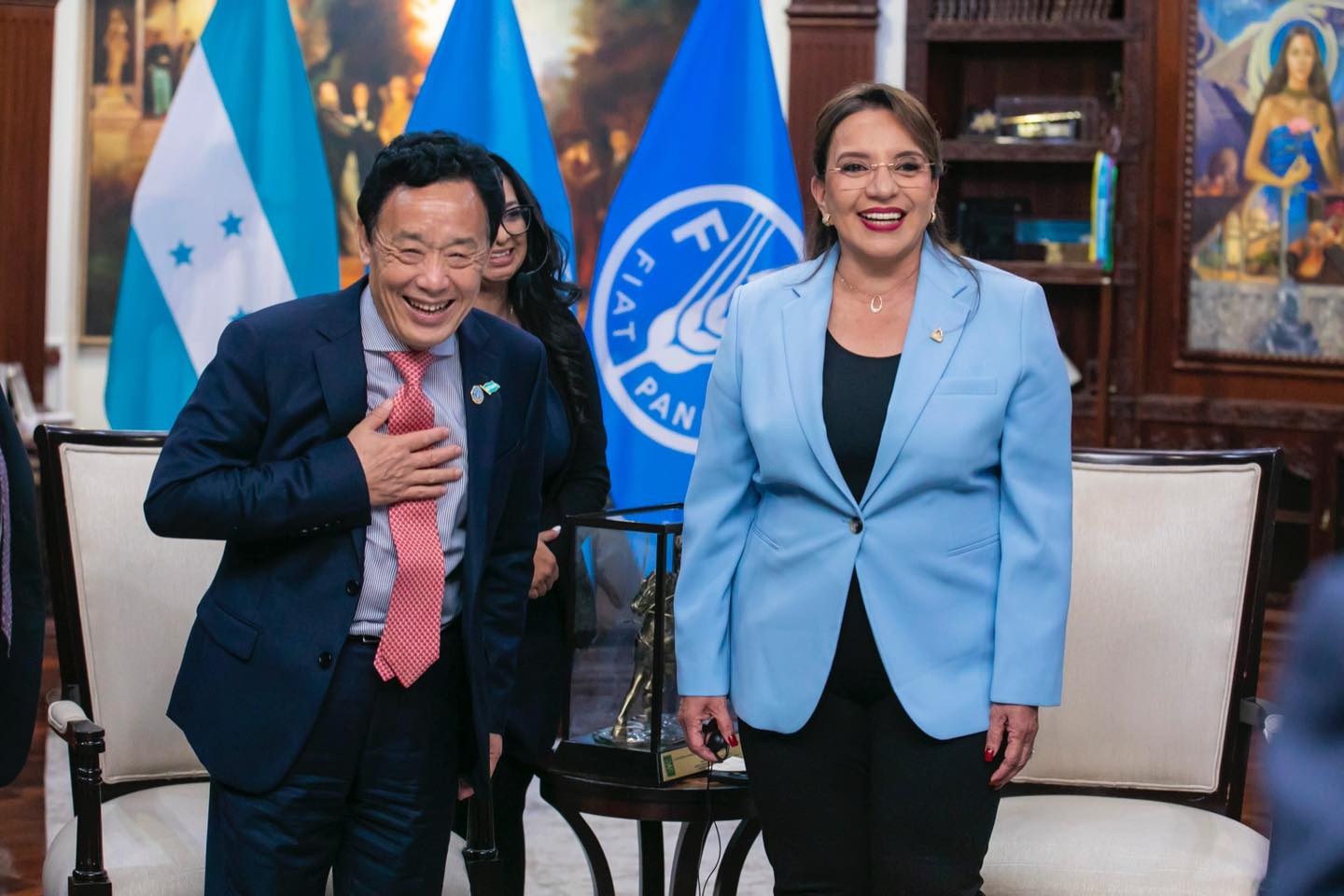 La presidenta Xiomara Castro recibió al director general de la Organización de las Naciones Unidas para la Alimentación y la Agricultura (FAO), Qu Dongyu, quien llegó al país con el propósito de visitar los diferentes proyectos que esta entidad impulsa en materia de producción y seguridad alimentaria.